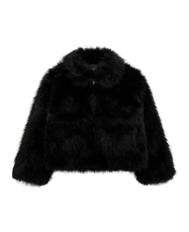 Deux par Girls Faux Fur Short Coat Black and Red with Hearts