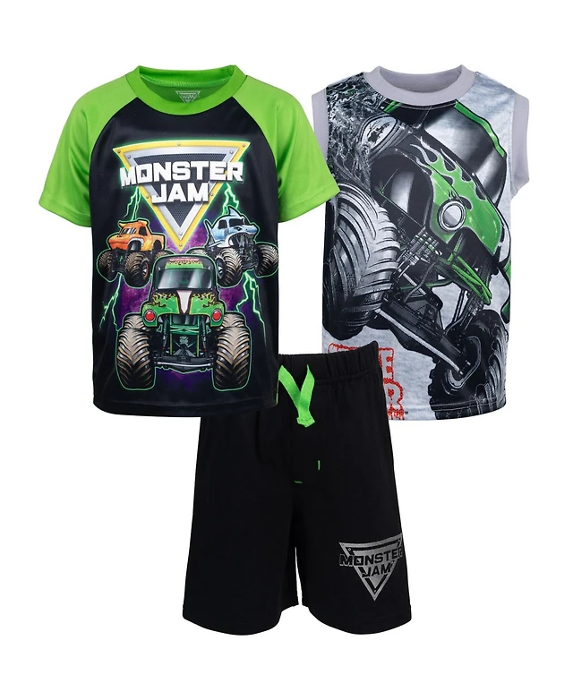 Monster Jam Boys Grave Digger El Toro Loco Megalodon T-Shirt Tank Top and French Terry Shorts 3 Piece Set to