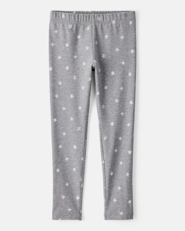 Girls Snowflake Print Cotton Pull-On Stretch Leggings - Grey