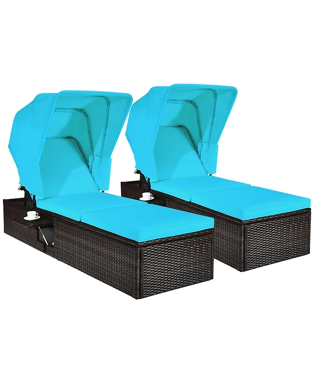 2PCS Patio Rattan Lounge Chair Chaise Cushioned Top Canopy Adjustable