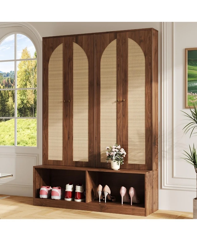 Streamdale Farmhouse Hall Tree - Rattan Doors, Bench, Hooks, Shoe Cabinet - Walnut, 55.1"W