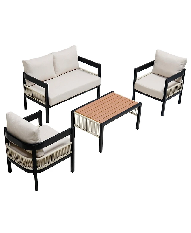 4PCS Wooden Patio Furniture Set Table Sofa Chair Cushioned Garden