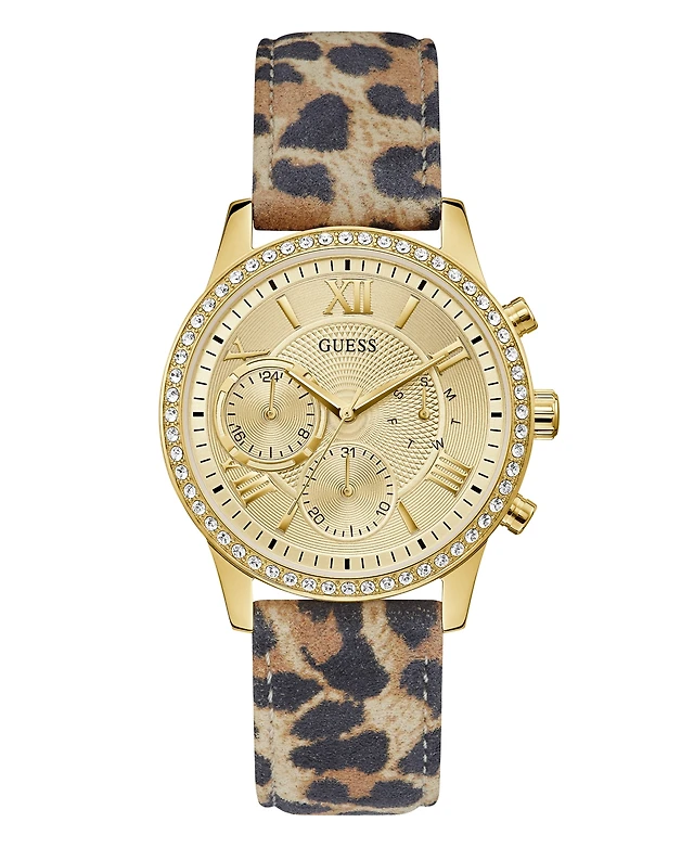 Guess Women's Gold-Tone Glitz Animal Print Genuine Leather Strap Multi-Function Watch, 40mm