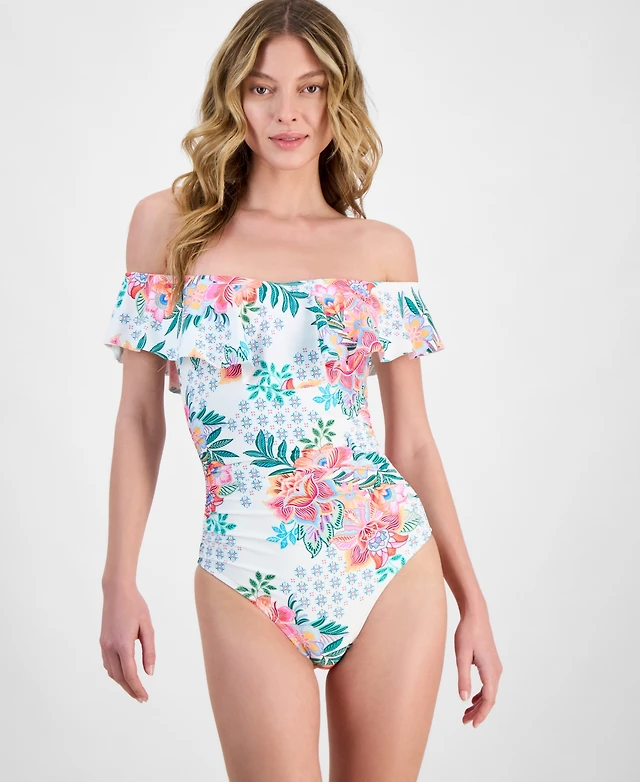Longitude by Mimi Flamingo Women's Fine China Ruffle Front Surplice One Piece Swimsuit