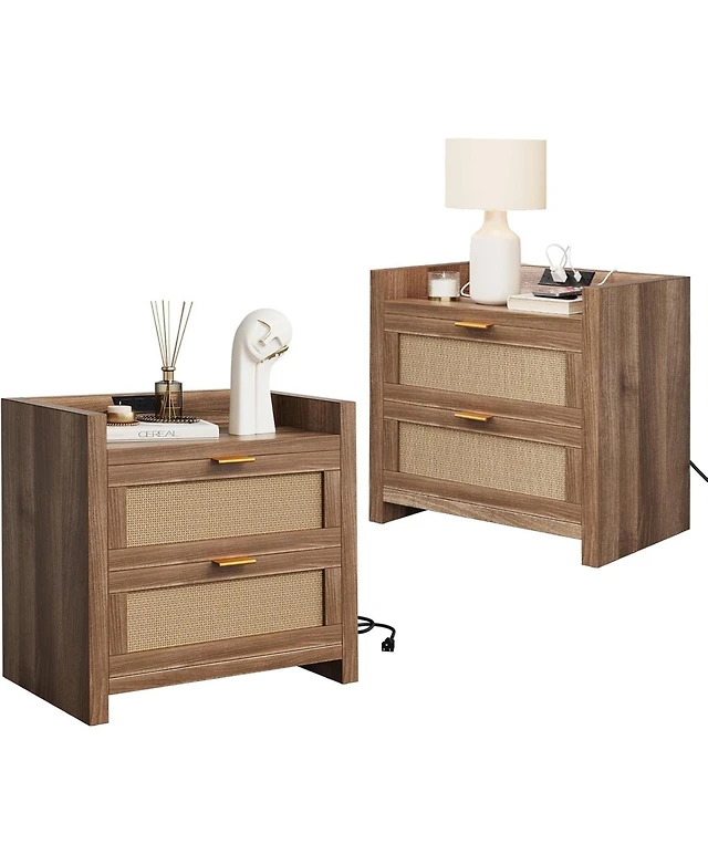 Wlive Farmhouse Nightstand, End Table with Charging Station, Bedroom Wooden Night Stand with 2 Storage Drawers, Side Table with Usb Ports and Outlets,