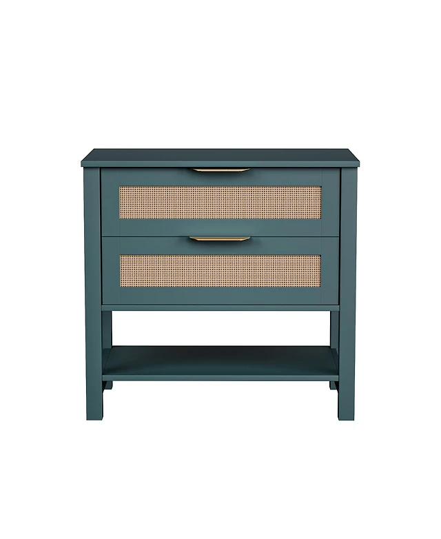 Sugift Boho Accent Table Nightstand with 2 Handwoven Rattan Decorated Drawers-White