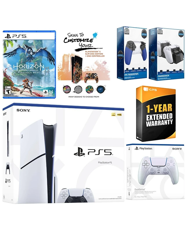Sony Playstation 5 Slim Disc Bundle with Horizon Forbidden West, Extra Controller, Fps Grip Kit, Dual Charge Dock and MightySkins Decal Voucher