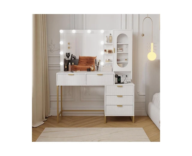 Corner Vanity Desk Cosmetic Vanity Station with Led Mirror,& Power Outlets
