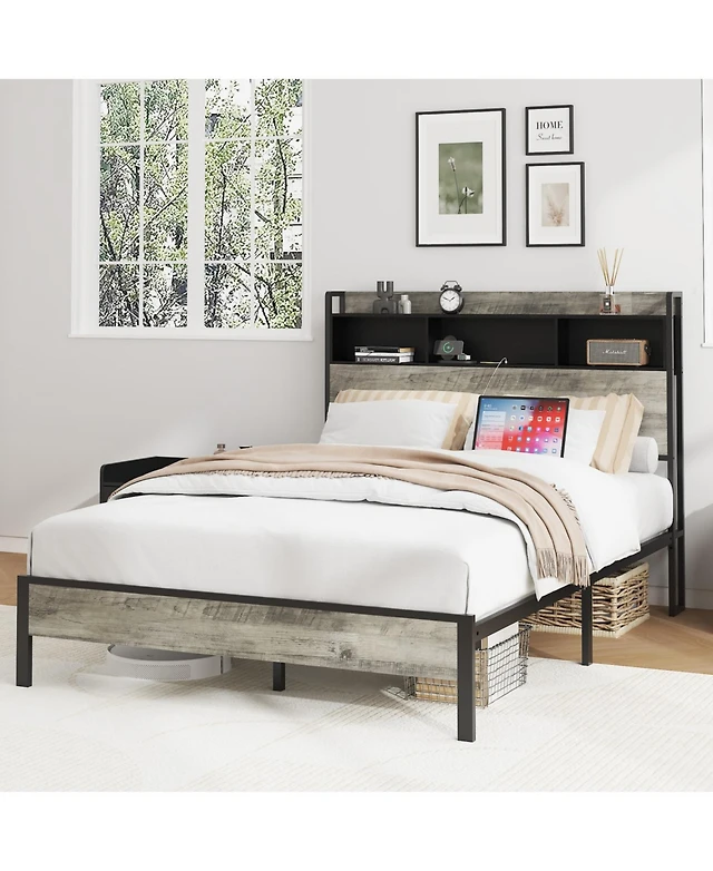 Gymax Industrial Platform Bed Frame with Charging Station Storage Headboard