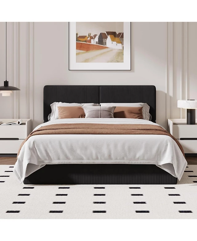 gaomon King Size Corduroy Upholstered Bed Frame Platform Tall Vertical Stripe Wingback Headboard No Box Spring Wooden Slats Beige