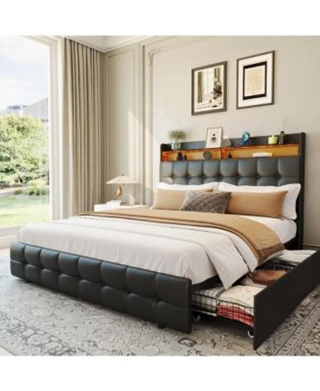 Streamdale Furniture Queen Metal Platform Bed Frame with Headboard, Led Lights, Storage, Usb Charger