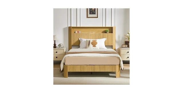Streamdale Furniture Full Xl Bed Frame- Storage Headboard, Charging Station, Natural