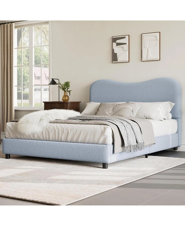 gaomon Full Size Blue Boucle Bed Frame with Upholstered Headboard, Low Profile, Heavy Duty Wooden Slats, No Box Spring Needed