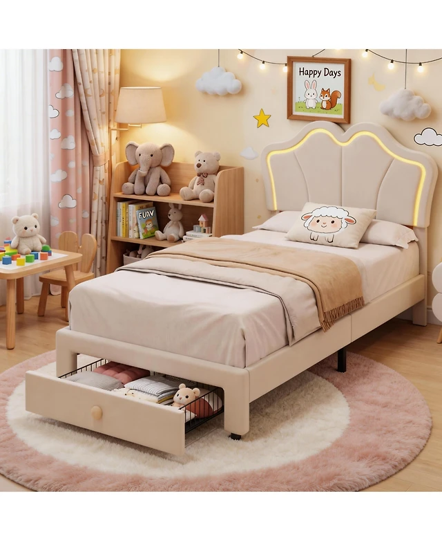 gaomon Twin Velvet Bed Frame Smart Led Adjustable Bear Headboard Wooden Slats Kids Platform No Box Spring