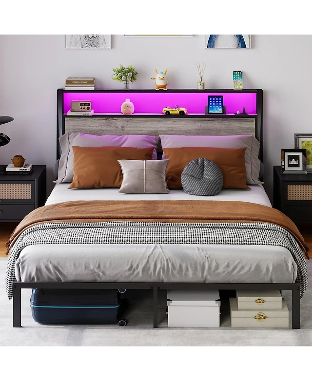 Homfan Bed Frame With Led Lights Upholstered Headboard Storage Shelves Heavy Duty Metal Slats