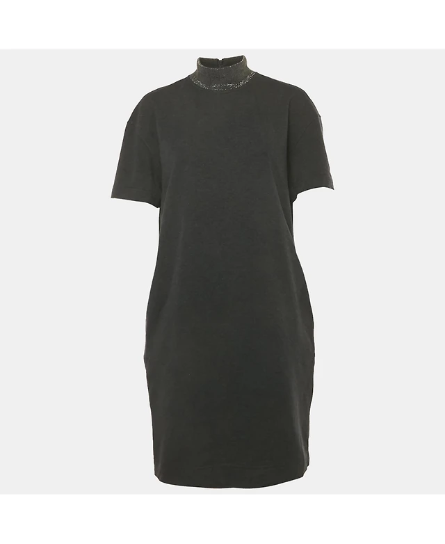 Pre-Owned Brunello Cucinelli Women's Charcoal Grey Cotton Knit Monili Trim Detail Shift Dress