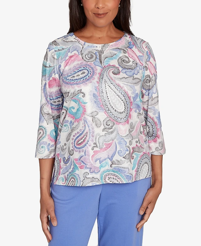 Alfred Dunner Women's Casual Vibe Pleated Paisley Crew Neck Top