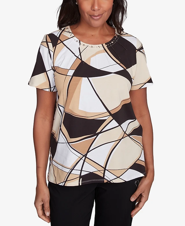 Alfred Dunner Petite Geometric Top with Detailed Neckline