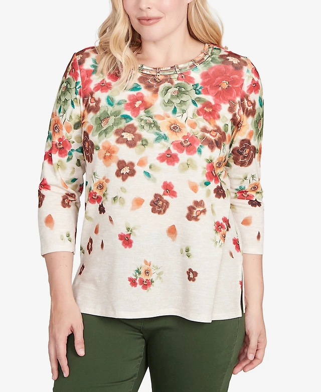Alfred Dunner Women's Mount Laurel Floral Detailed Neck Top