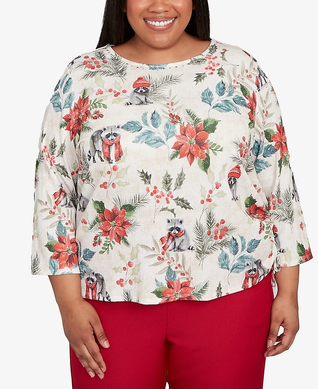 Alfred Dunner Plus Classic Holiday Poinsettias Crew Neck Top