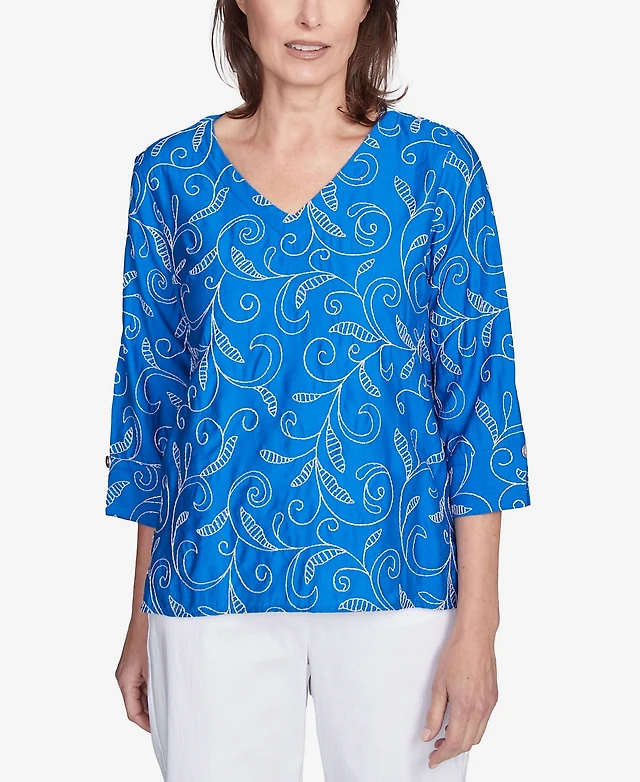 Alfred Dunner Women's St. Augustine Blooming Floral Embroidered Split Neck Top