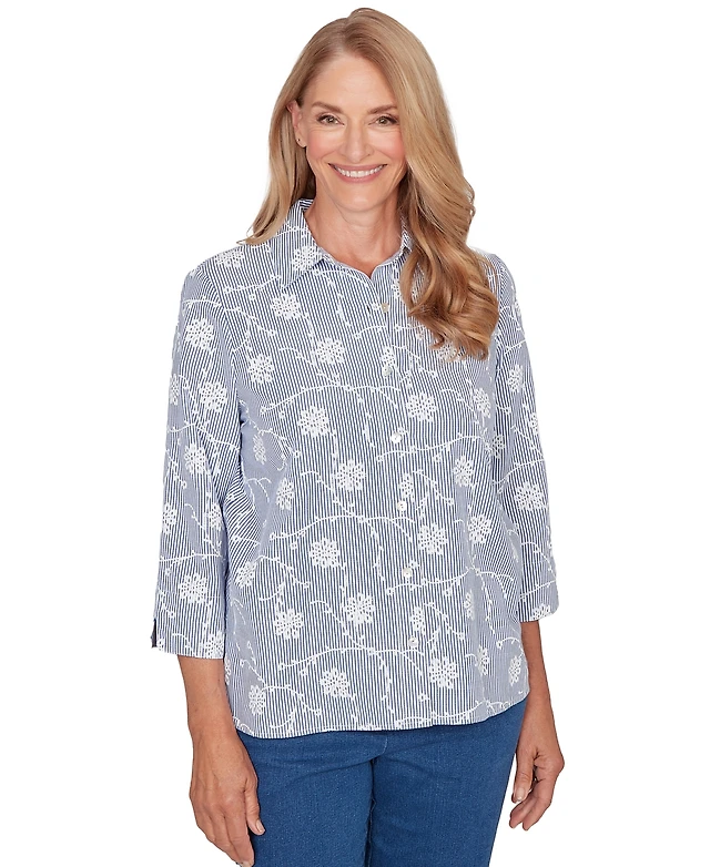 Alfred Dunner Petite Classics Puff Print Pinstripe Embroidered Collared Top