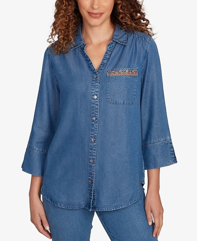 Alfred Dunner Petite Lake Champlain Embroidered Sleeve Button Detail Top