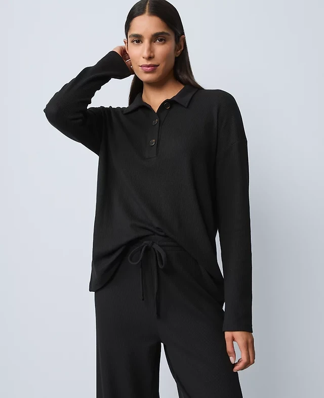 Ann Taylor Waffle Henley Lounge Top Black Women's