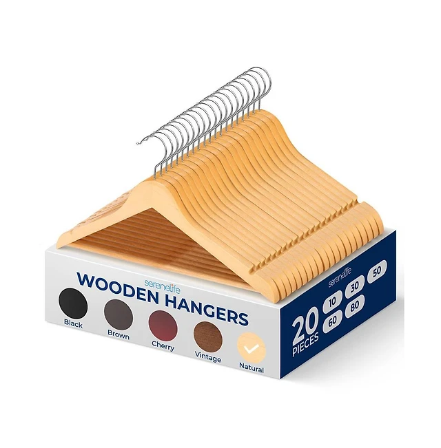 SereneLife 80-Pack Solid Wooden Hangers – Heavy Duty Natural Wood with 360° Swivel Hook, Shoulder Notches & Pants Bar – Space-Savin