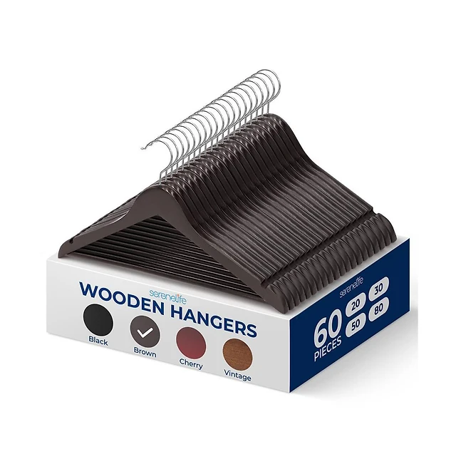 SereneLife 60 Pieces Wooden Hangers - Non-Slip, Sturdy, and Heavy Duty Suit Hanger Set with Chrome 360° Swivel Hook (Brown)