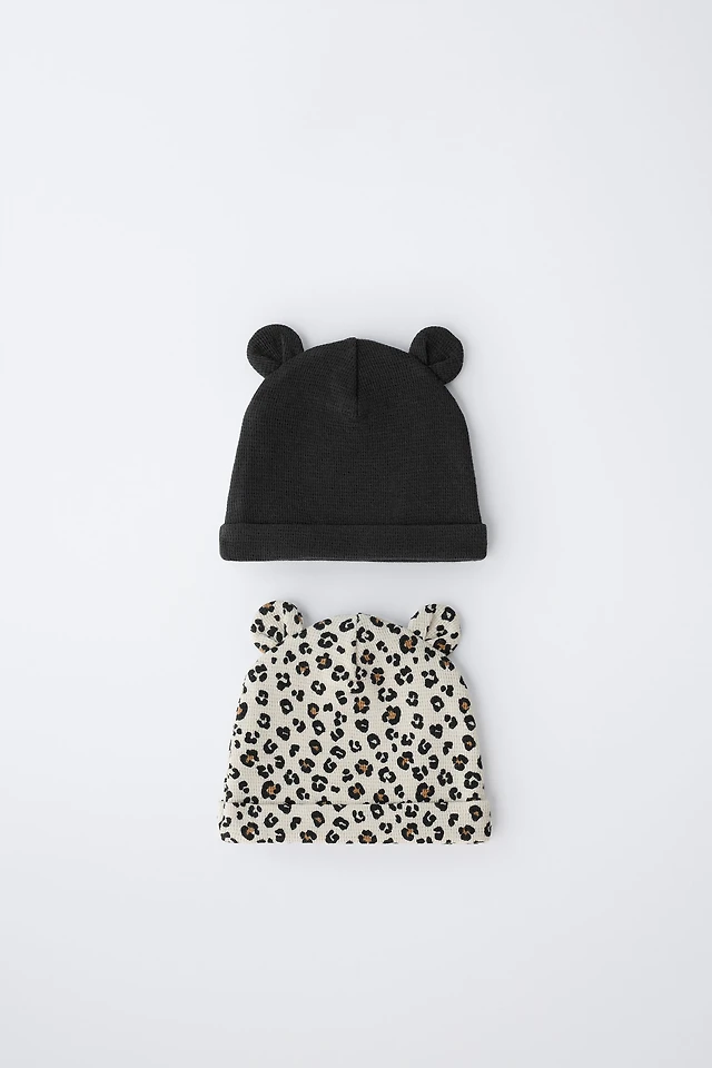 TWO-PACK OF WAFFLE KNIT EAR HATS WITH ANIMAL PRINT