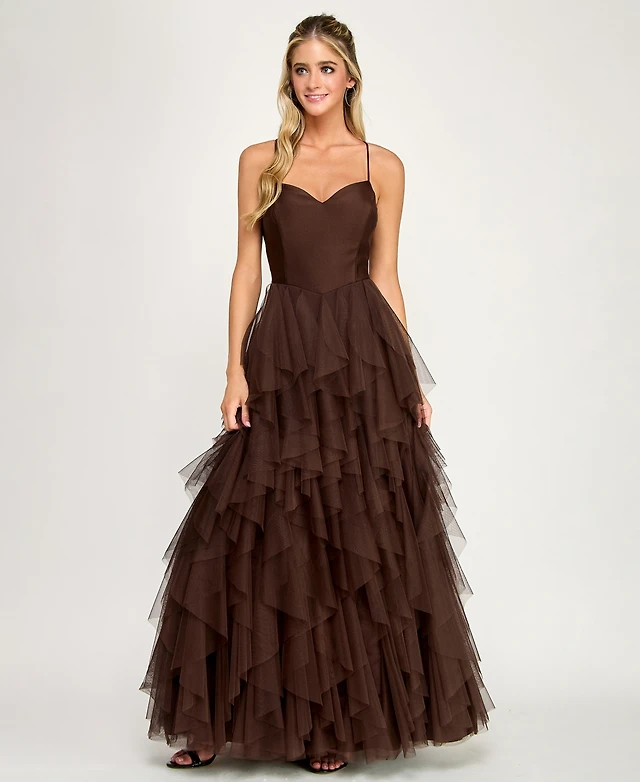 City Studios Juniors' Open Back Mesh V-Neck Cascade Layered Gown