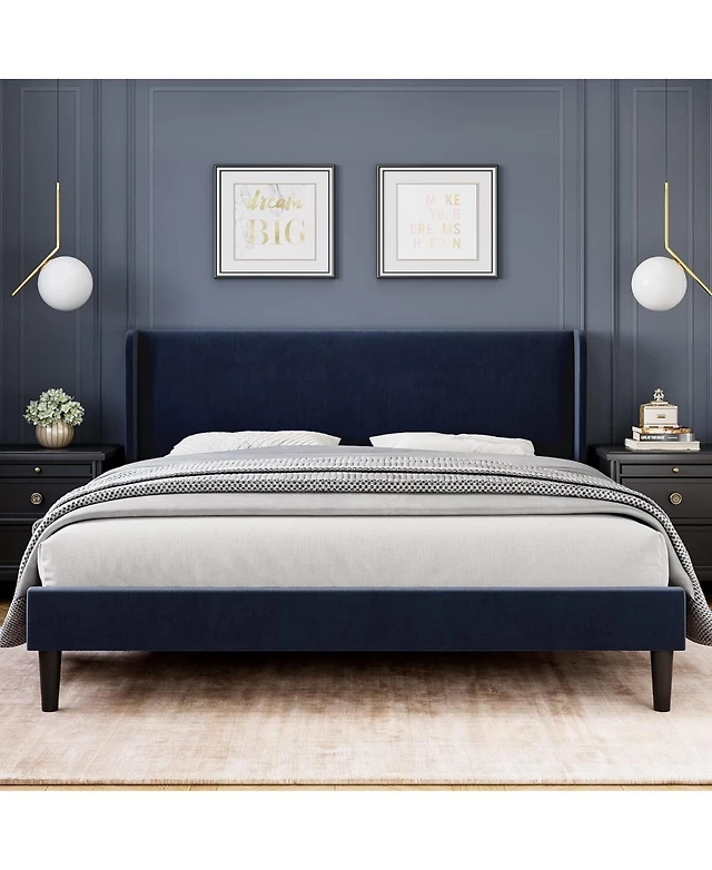 gaomon Full Upholstered Platform Bed Wingback Headboard Velvet 2 Storage Pockets Wooden Slat Support Box Spring Optional