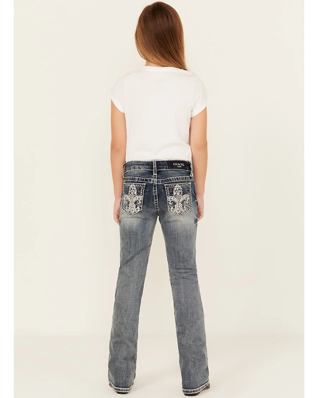 Grace La Girls' Floral Steerhead Embroidered And Embellished Bootcut Stretch Denim Jeans