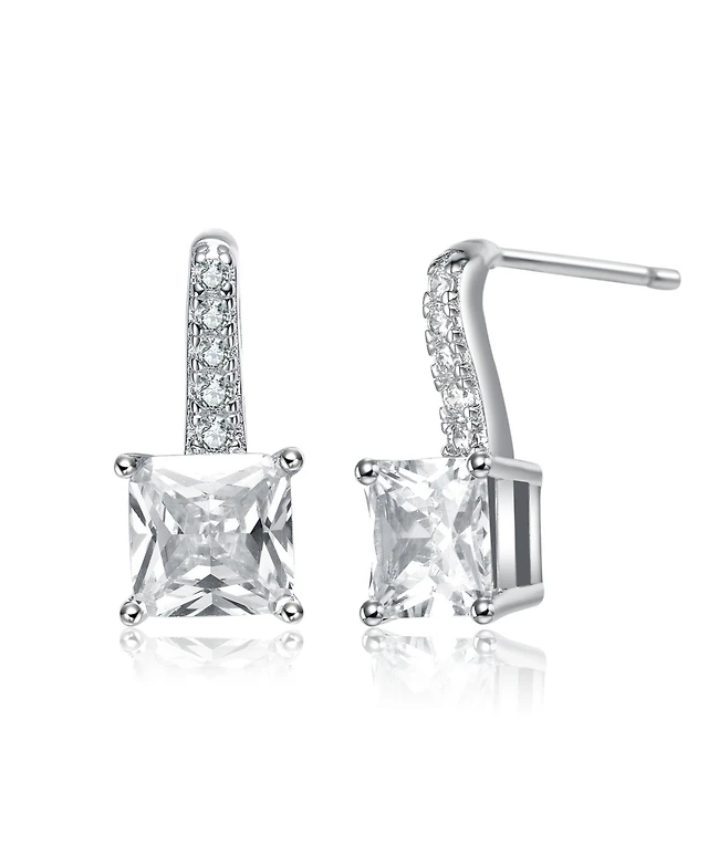 White Gold Plating with Clear Cubic Zirconia Radiant & Round Three-Stone Drop Earrings