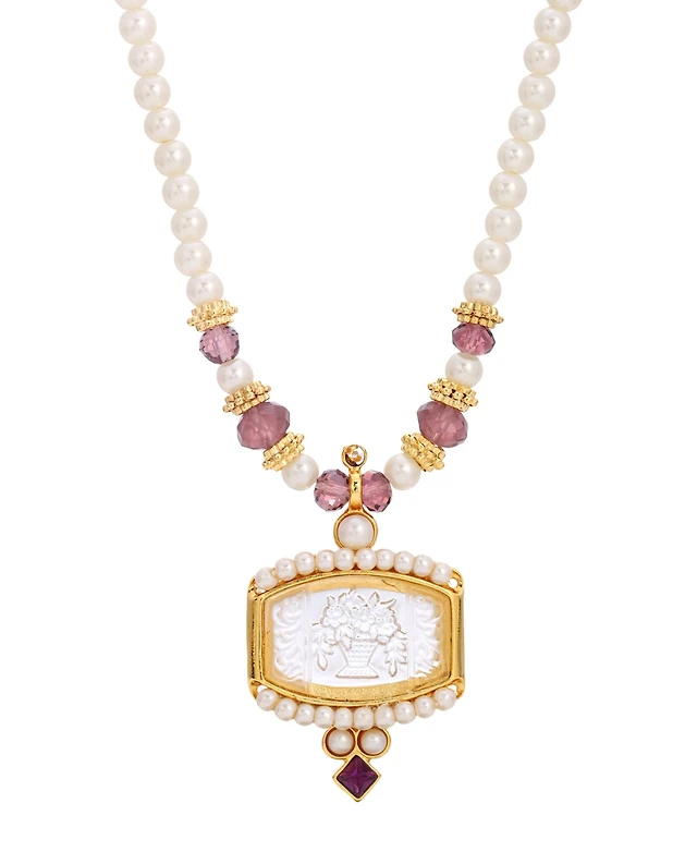 2028 Gold-Tone Imitation Pearl Etched Glass Intaglio Stone Necklace