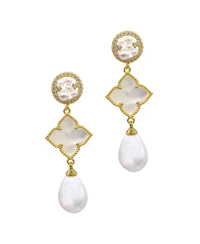 Rachel Glauber 14K Gold Plated With White Mother of Pearl Heart & Circular Drop Earrings