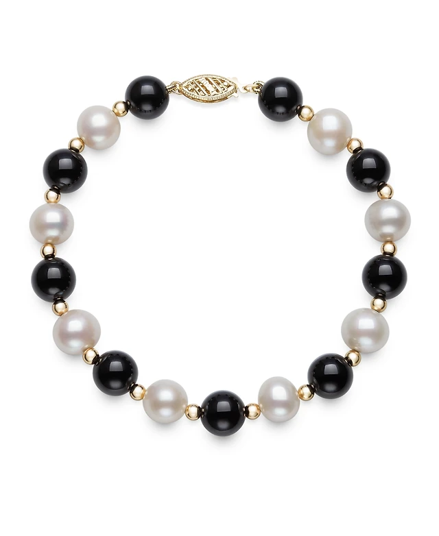Macy's Freshwater Pearl (7.5-8.5mm), Black Onyx and Gold Bead Necklace in 10k Yellow Gold