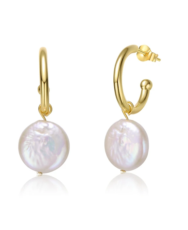 Sterling Silver 14k Yellow Gold Plated with White Coin Freshwater Pearl Drop C-Hoop Earrings
