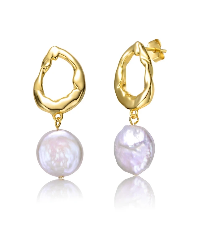Sterling Silver 14k Yellow Gold Plated with White Coin Freshwater Pearl Twisted Halo Circle Dangle Drop Earrings