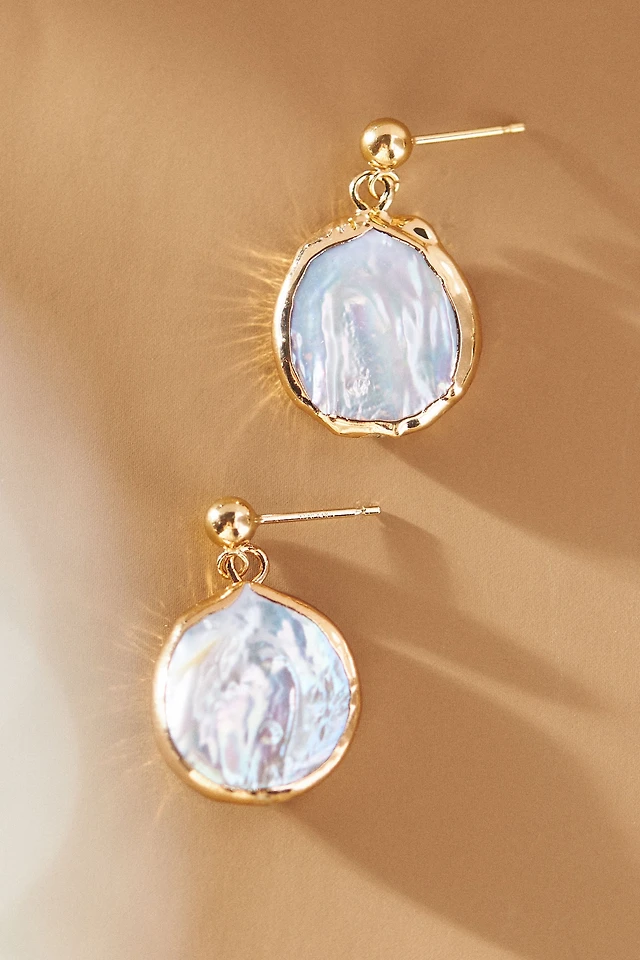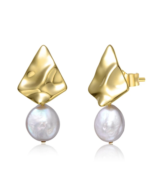 Sterling Silver 14k Yellow Gold Plated with White Coin Freshwater Pearl Drop Geometric Rippled 3D Double Dangle Earrings
