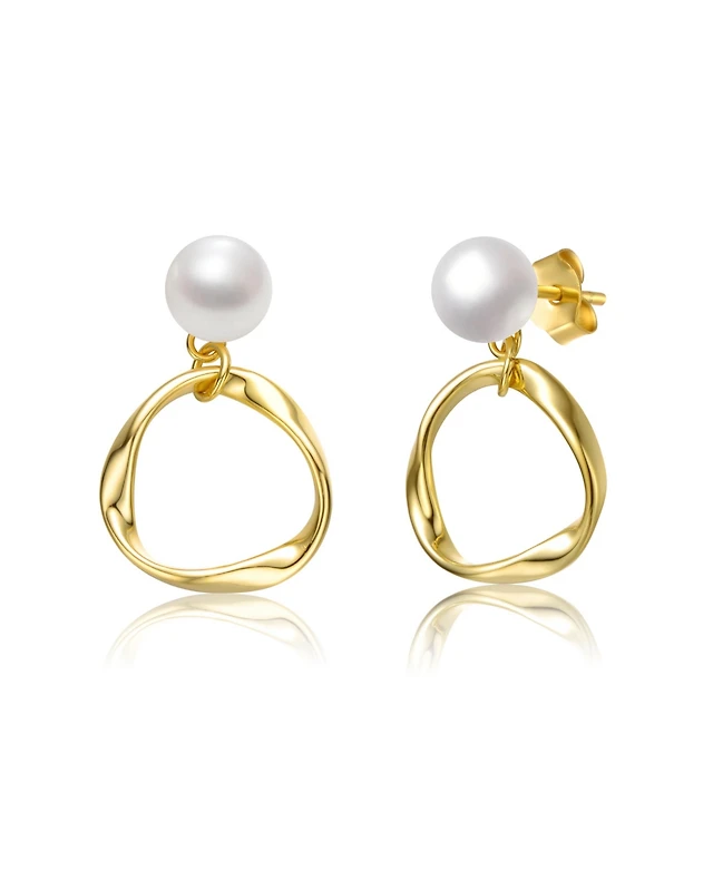 Sterling Silver 14k Yellow Gold Plated with White Freshwater Pearl Twisted Eternity Circle Halo Double Drop Dangle Earrings