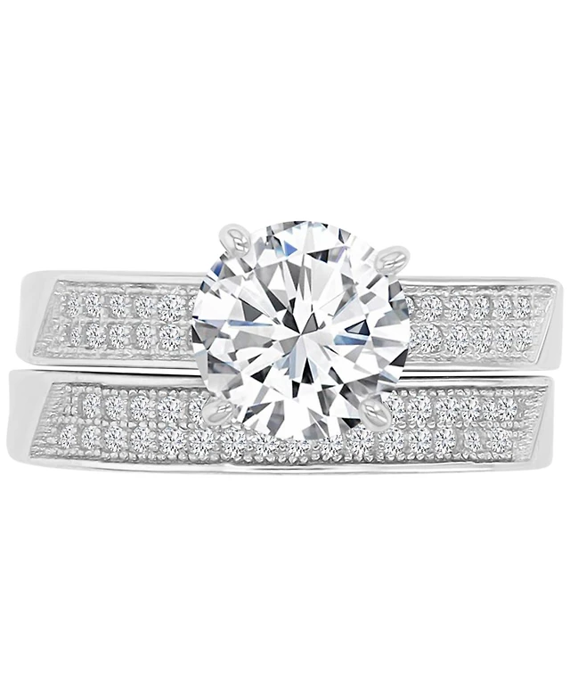 Cubic Zirconia Solitaire & Pave Milgrain Bead Bridal Set Sterling Silver