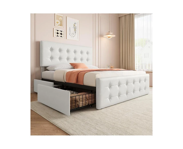 gaomon Queen Size Bed Frame with 4 Storage Drawers and Headboard, Pu Upholstered Platform Bed Frame with Stitched Button Tufted Design