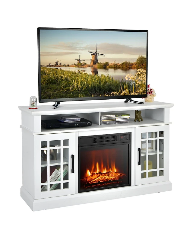 White Tv stand with top cabinets, entertainment center tempered glass doors, wooden media console