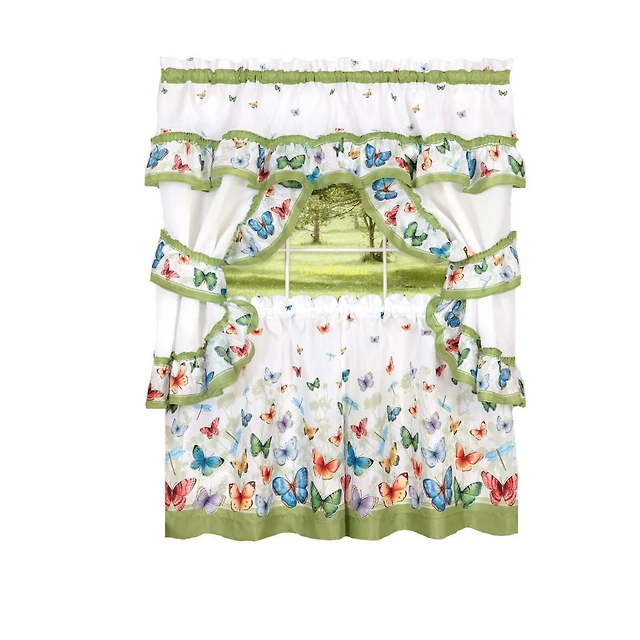 Hlc.me Butterfly Floral Lace - Sheer 3 Piece Kitchen Curtains Set, Light Filtering Transparent Window Swag Valance + 36 inch Tiers Set