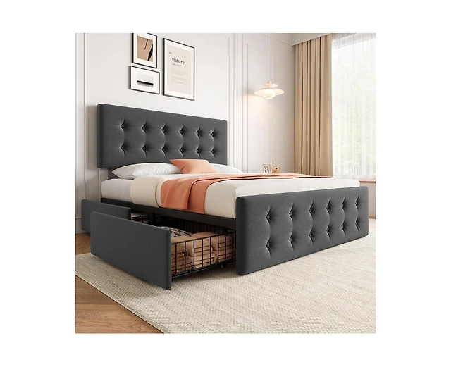 Bed Frame,With 4 Storage Drawers And Headboard, Linen Upholstered Platform Frame With Wooden Slats Support, Button Tufted Design