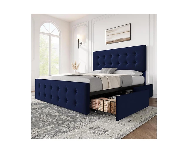 gaomon Queen Bed Frame with 4 Storage Drawers and Headboard, Velvet Upholstered Platform Wooden Slats Support, Button Tufted Desig