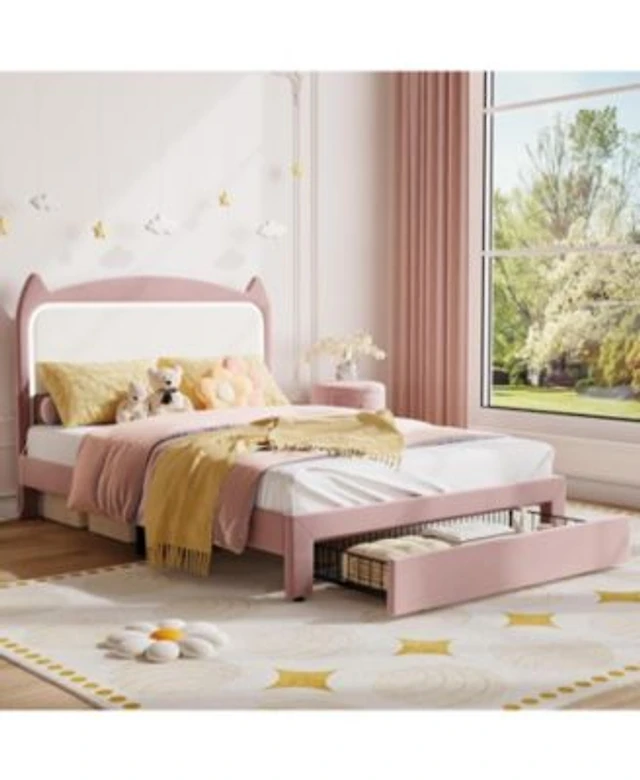 gaomon Twin Kids Bed Frame with Storage Drawers, Velvet Upholstered Headboard