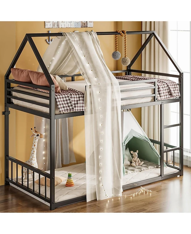 Likimio Twin Over Twin Metal Bunk Bed with Ladder & Guardrail, House-Shaped Frame, Space-Saving Design, No Box Spring Needed – Black